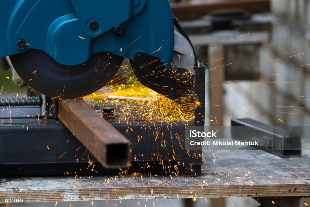 Iron pipe cutting saw for metal with bright sparks close up. SAW CUTTING